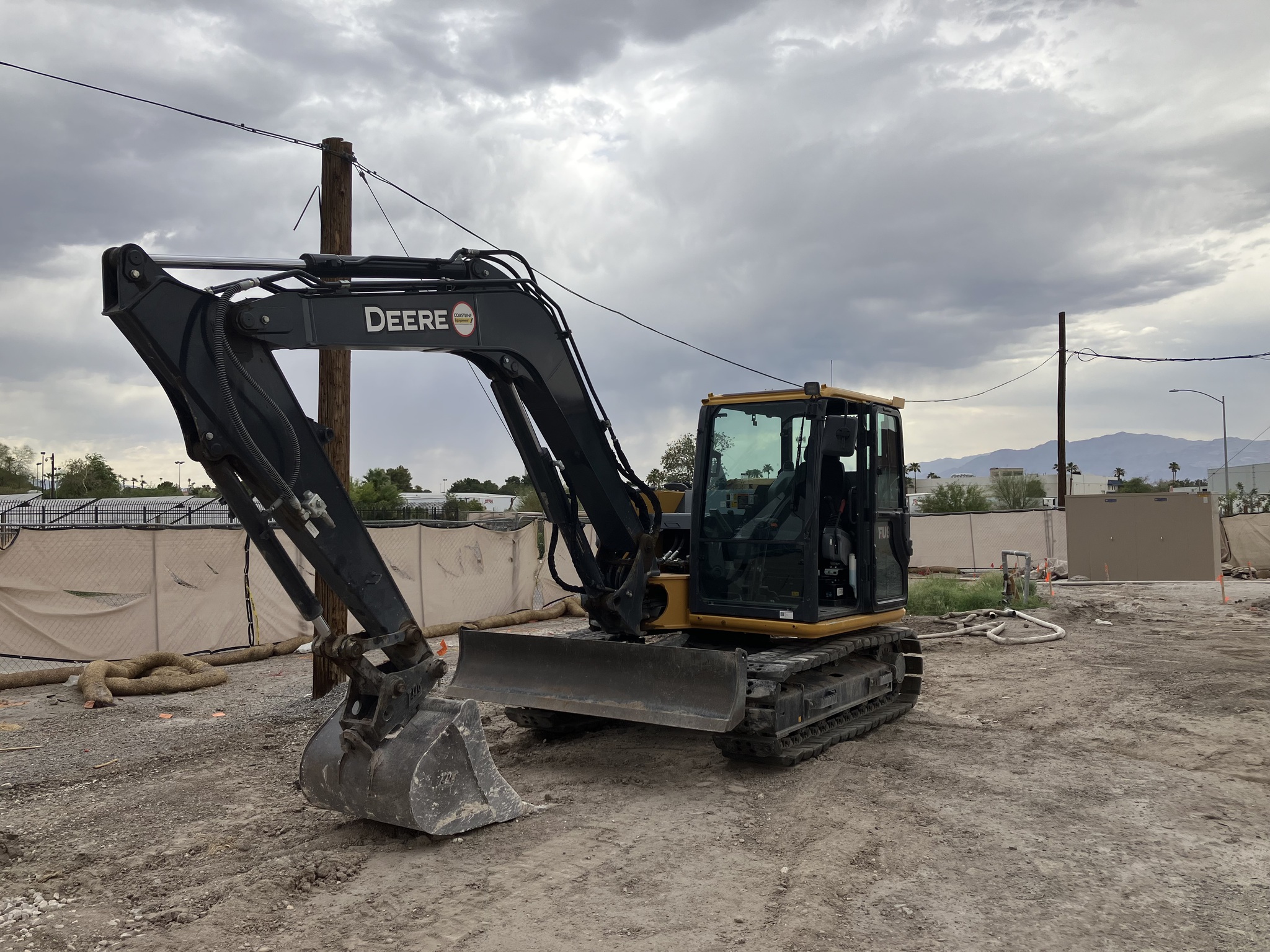 ROPS, Cab w/ AC, Cntrl Pattern Select; Medium-Long Arm; Standard Boom; Rubber Pads, Rubber Tracks; Aux Hydraulics, Coupler; w/ Blade